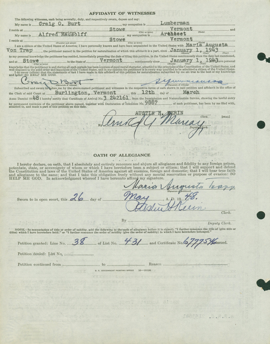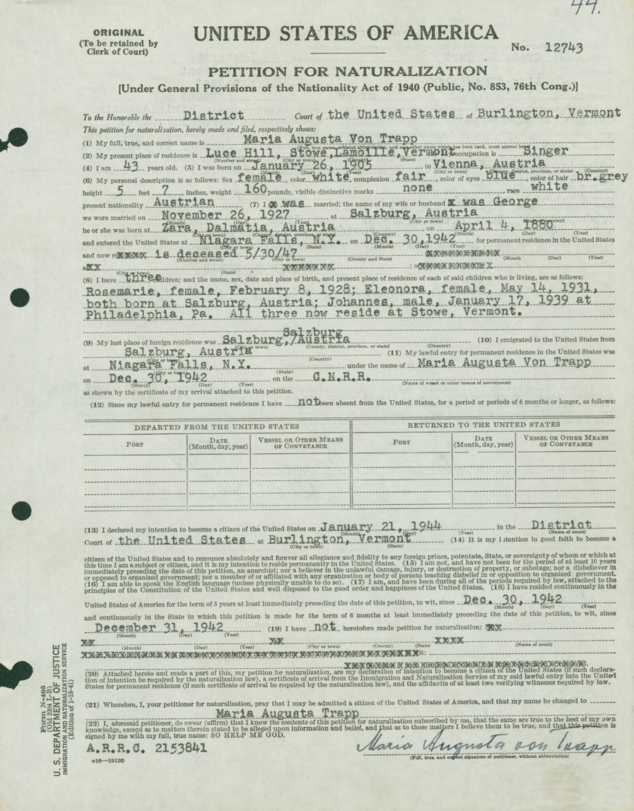 In the early 1940s the family settled in Stowe, Vermont, where they bought a farm. They ran a music camp on the property when they were not on tour. In 1944, Maria and her stepdaughters Johanna, Martina, Maria, Hedwig, and Agathe applied for U.S. citizenship by filing declarations of intention at the U.S. District Court in Burlington, Vermont. Georg apparently never filed to become a citizen; Rupert and Werner were naturalized while serving in the U.S. armed forces during World War II; Rosmarie and Eleonore derived citizenship from their mother; and Johannes was born in the United States and was a citizen in his own right.