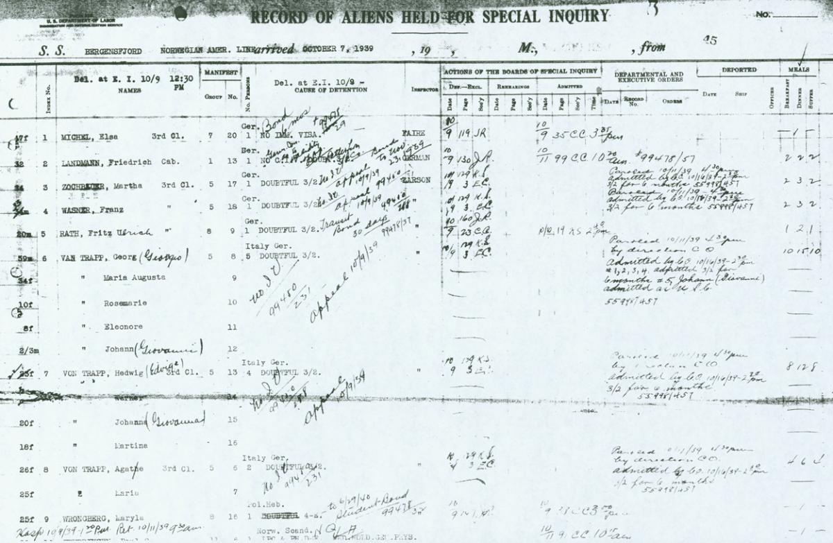 The National Archives and Records Administration, Northeast Region–Boston in Waltham, Massachusetts, holds the original records of the von Trapps' naturalizations as U.S. citizens. Declarations of intention, petitions for naturalization, and certificates of arrival are in Petitions and Records of Naturalization, U.S. District Court for the District of Vermont, Records of District Courts of the United States, Record Group (RG) 21. The passenger arrival list of the SS Bergensfjord and the Record of Aliens Held for Special Inquiry are in Passengers and Crew Lists of Vessels Arriving at New York, New York, 1897–1957 (National Archives Microfilm Publication T715), Records of the Immigration and Naturalization Service, RG 85, and are held in many National Archives locations.
