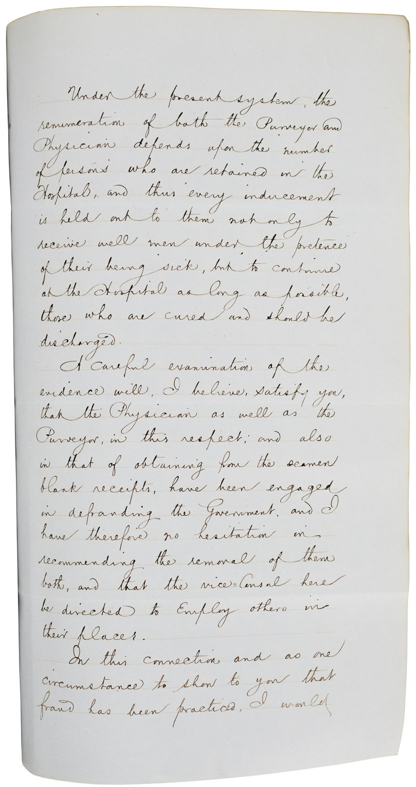 "Seamen have been retained in the hospitals long after they had recovered their health and demanded their discharge. And such being the fact in many instances the opinion (and a well-founded one, too) of every man in this community is that such as course is pursued by the consuls for the purpose of profiting from the charge against the government for board and lodging, medical attendance and clothing furnished such inmates, and it is self-evident that the consuls share in such profits fraudulently and corruptly derived," wrote the anonymous informant, who is described as a member of Hunt's board of investigation.
