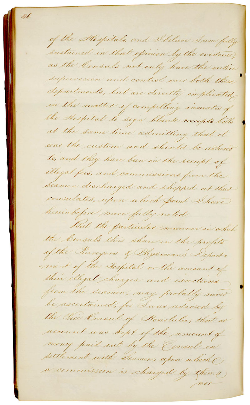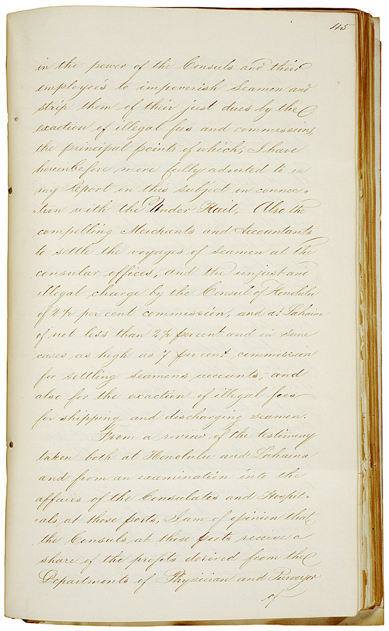 "The amount thus illegally paid by the sailor at the consulate of Honolulu being not much less than $5,000 for commissions on wages, and the sum of $1 for shipping, and the retention of $1 from the two-months' extra wages, swells the illegal and unjust exactions of this consulate to the enormous sum of $9,000 per annum," wrote the investigator.