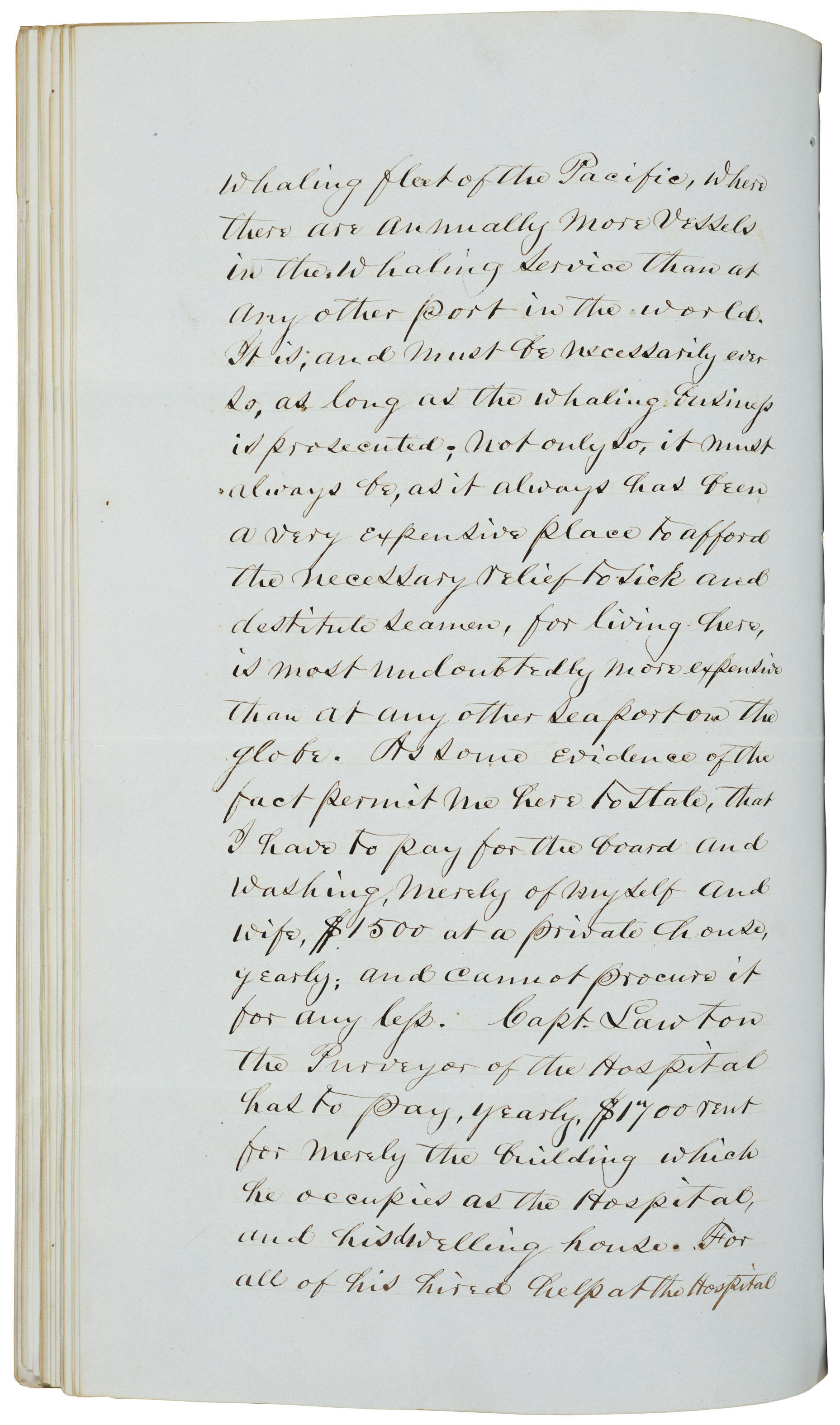When U.S. Consul Joel Turrill took over the Honolulu post in 1846, he conducted his own investigation of the high costs associated with the Hawaiian ports. He reported costs at Hawaiian ports had continued to remain high due to the high volume of visits from American whaling ships. In fact, because of its modern standard of medical care and mild climate, Hawaii remained the best place in the Pacific for American sailors and whalers to recover from their injuries and illness.
