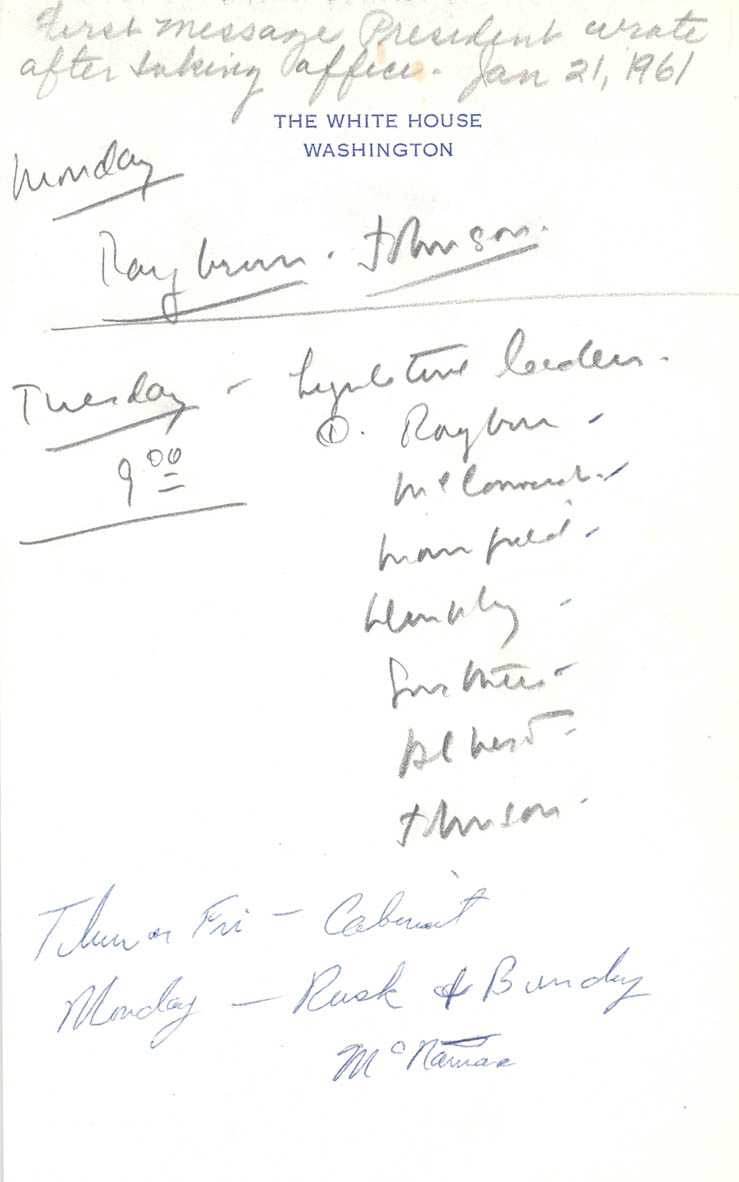 By far the largest amount of material recovered were thousands of pages of documents from President Kennedy and his staff documenting the official business of the White House as well as important files from his years as a U.S. senator. There also are some personal accounts and bills belonging to the President and the First Lady and handwritten doodles by Kennedy, including the first message he wrote after taking office on January 21, 1961, planning the week's meeting schedule: "Monday—Rayburn + Johnson" "Tuesday 9:00 Legislative leaders" "Thurs or Fri—Cabinet" "Monday—Rusk + Bundy McNamara." There are also medical records consisting of correspondence, statements, an immunization record, prescriptions, and notes relating to Kennedy's health and medical care.