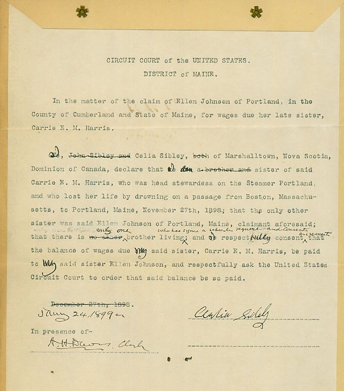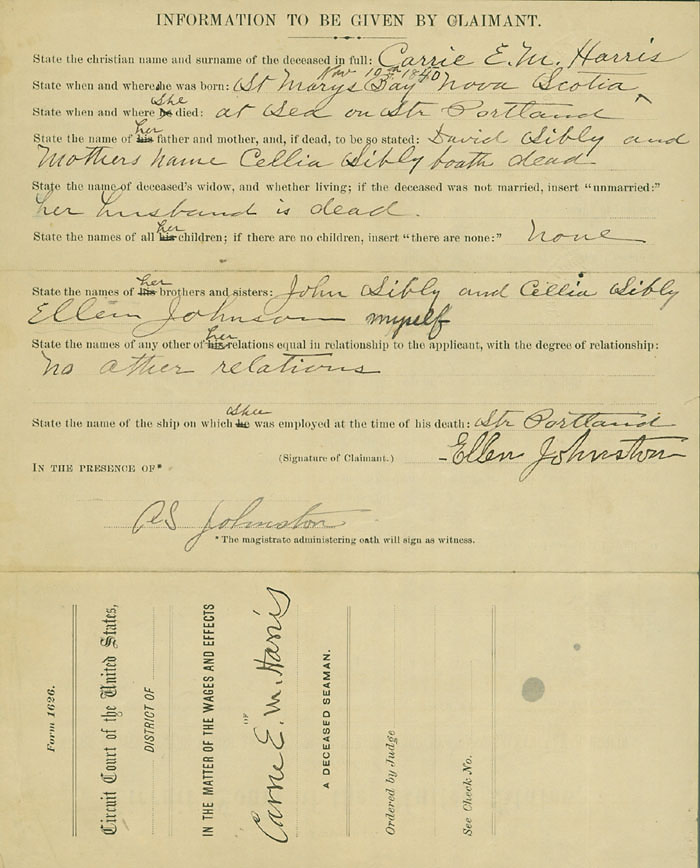On that same day, Ellen also filed a claim for the wages of her sister. From this we learn that Carrie was born at St. Marys Bay, Nova Scotia, November 10, 1840, to David and Cellia [sic] Sibley, both deceased. She was a widow and had no children. Her siblings included one brother, John Sibley, and two sisters, Cellia Sibley, and Ellen Johnson [sic]. In January of 1899, both John and Cellia Sibley sent affidavits from Nova Scotia to the court in Portland, asking that their share of Carrie's wages be paid to their sister, Ellen Johnston.