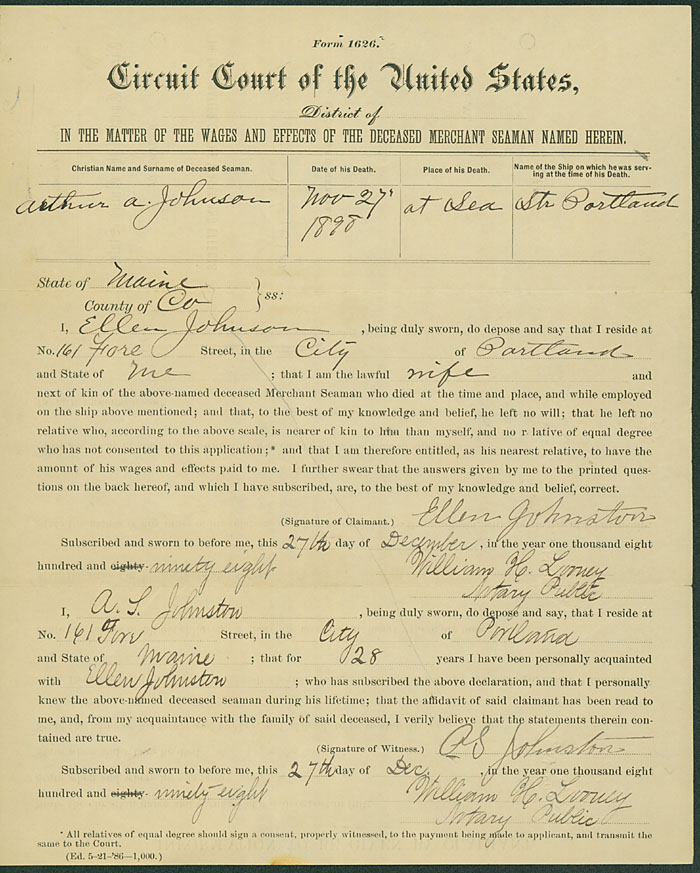 U.S. District Court at Portland, Maine, petition of liability filed by the Portland Steamship Company, and U.S. Circuit Court, Maine, case files of deceased and deserted seamen, 1873–1911, Records of District Courts of the United States, Record Group 21.