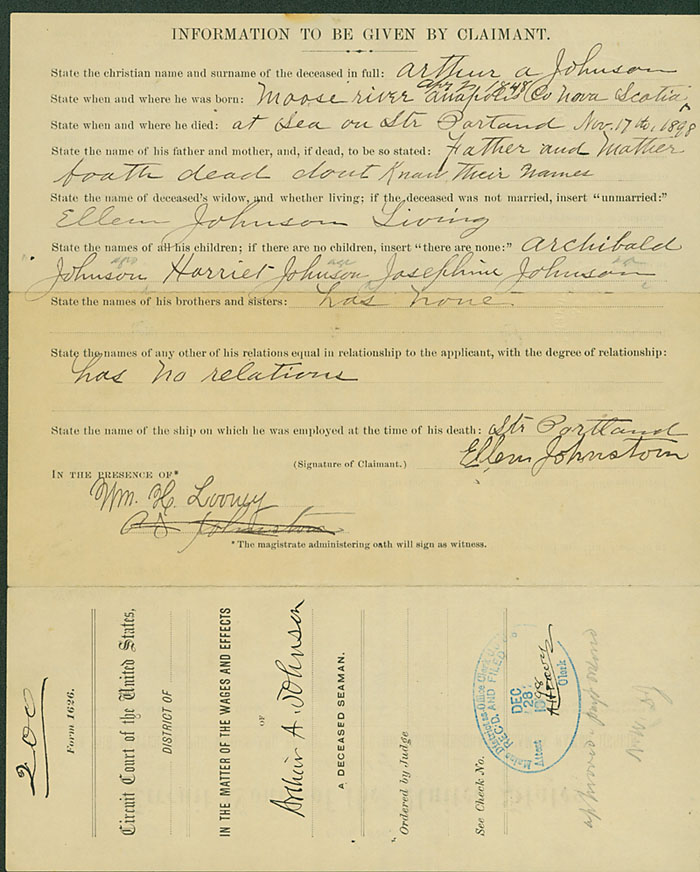 For Ellen Johnston of Portland, Maine, the sinking of the vessel was doubly tragic. Both her husband, Arthur, and her sister, Mrs. Carrie E.M. Harris, were lost. Ellen filed a claim for her husband's wages on December 19, 1898. She stated that her husband had been born at Moose River, Annapolis County, Nova Scotia, on April 2, 1848. His parents were both deceased, and his survivors included three children, Archibald, Harriet, and Josephine. The 1900 census of Portland, Maine, showed Helen [sic] with her children and revealed that they were black, all born in Nova Scotia.