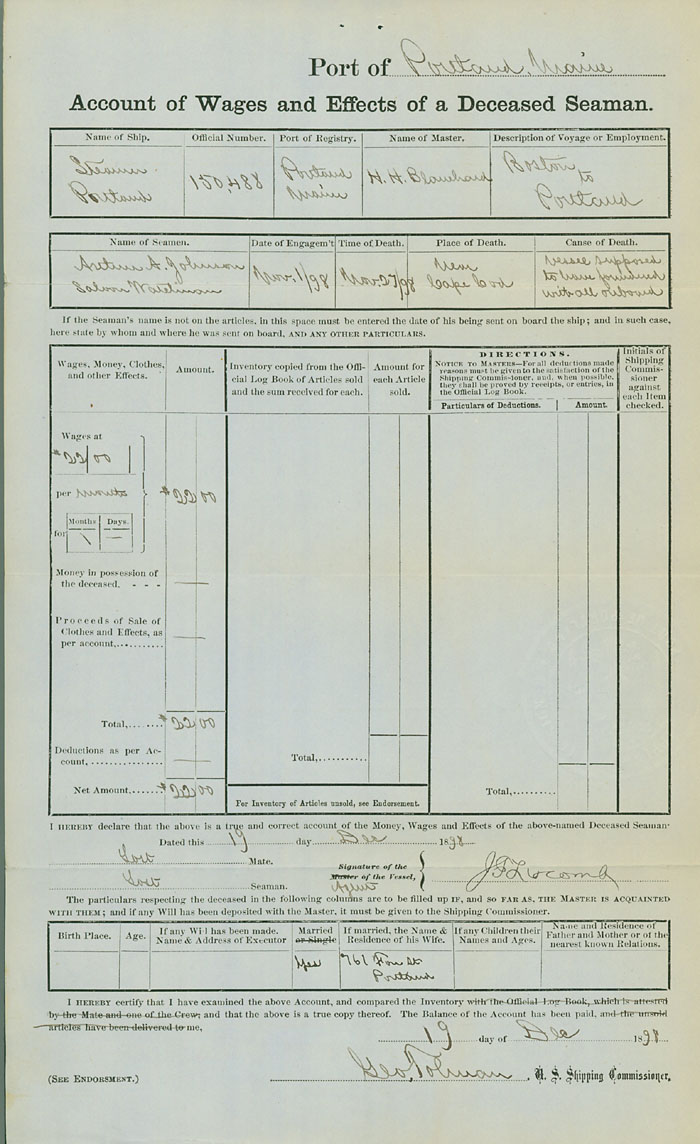 In the records of the U.S. Circuit Court, Maine, one finds the case files of deceased and deserted seamen, 1873–1911 [digitized and available at Maine & Massachusetts, Case Files of Deceased and Deserted Seamen, 1837–1965]. Under an act of June 7, 1871, Congress authorized the office of "shipping commissioner" in federal circuit courts whose jurisdictions included seaports or customs ports of entry. Among their duties, commissioners collected the wages due to deceased seamen from the vessel's master or owners and turned the money over to the court for delivery to the legal heirs. Unclaimed monies would eventually be turned in to the U.S. Treasury. Claimed funds would be paid only after the court was satisfied that the proper person was getting the money. To that end, these case files provide extensive family information through preprinted forms or affidavits or both.