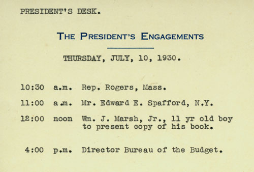 Hoover seemed quite pleased with his young friends. No so well known to the public is that Hoover loved the company of all children. All three smiled happily. The President accepted his specially printed copy and examined it. Billy had inscribed it "To our President, Herbert Hoover, from the author, William J. Marsh, Jr., New Milford, Conn., July 10, 1930, age 11 years."
