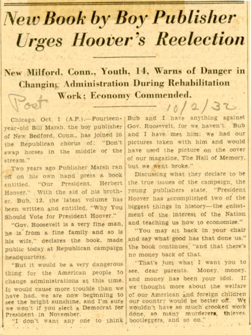 Buried in the archives of the Herbert Hoover Presidential Library and in faded clippings found in the library's newspaper clipping files is a brief biography of the beleaguered President by William J. Marsh, Jr., of New Milford, Connecticut, assisted by his nine-year-old brother Charles ("Bub"). For a few weeks the book created a sensation in major dailies. The most intensive coverage appeared in the New York Herald Tribune, but there were stories in the New York Times, the Washington Herald, and the Washington Post.