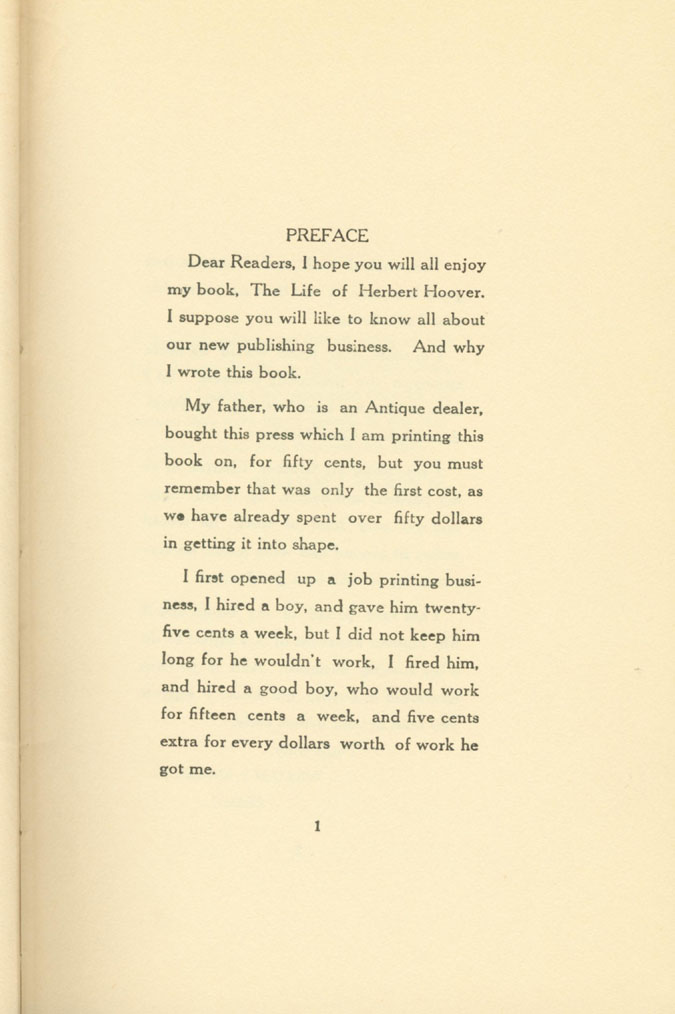 Like some of the most famous objects of art and scholarship, Our President Herbert Hoover occurred almost by accident. One day while rummaging through items his father, an antique dealer, had accumulated, Billy found a printing press his dad had bought for 50 cents. He tinkered with it until it worked and decided to start a printing business. Billy hired a boy to help him at 25 cents a week, but his hired hand proved lazy. So Billy employed his younger brother Charles at 10 cents a week, plus a small commission. Billy was a sharp businessman. Charles was not much more energetic than the first boy; he preferred to write music, aspiring to become a composer.
