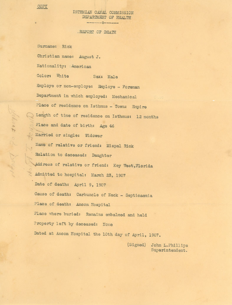 Deaths were common in the Panama Canal Zone due to work-related injuries and diseases. According to the probate case file, In the Matter of the Estate of August J. Rick, from the First Judicial Circuit, Rick died on April 10, 1907, in the Ancon Hospital. Although his entire possessions fit into one steamer trunk, the file is fairly extensive. The full inventory of goods and chattels lists 1 razor; 4 pearl buttons; one slipper, straw; 11 shirts, 2 undershirts; 2 pairs of drawers; and other items. The file also contains an Isthmian Canal Commission Department of Health's Report of Death that lists the following facts about Rick: American; foreman in Mechanical Department; lived in the Panama Canal Zone for 12 months; 46 years old; a widower; and had a daughter named Mispal Rick who lived in Key West, Florida.