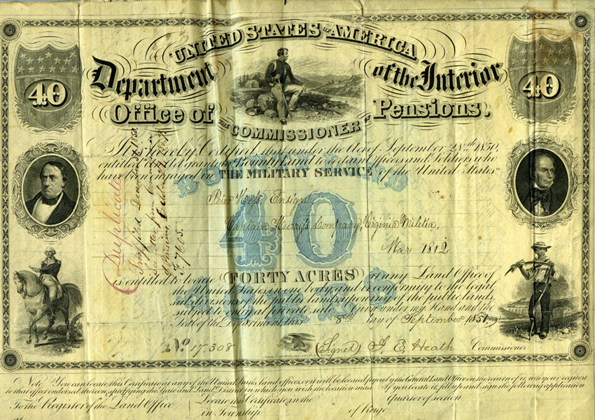 In a similar manner, Frederick Berlin of Upshur County, West Virginia, petitioned Congress in 1866 to validate an old 40-acre bounty-land warrant he acquired in 1859 from the heirs of Peter Hess, a veteran of the War of 1812. According to the General Land Office, the warrant had expired because Hess never applied for the land before he died on December 28, 1850. In his effort to convince Congress to honor the land warrant—which included an affidavit from the postmaster of Buckhannon, Upshur County, verifying that Peter Hess had in fact mailed an application to validate the warrant two days before he died—Berlin also submitted a duplicate but equally decorative copy of the original bounty-land warrant, dated September 8, 1851. The certificate identified Peter Hess's military rank (ensign) and his unit (Hurry's Company, Virginia Militia), while the reverse side contained a handwritten transcript of the legal transfer agreement between Berlin and the Hess heirs, all of whom were identified by name.23