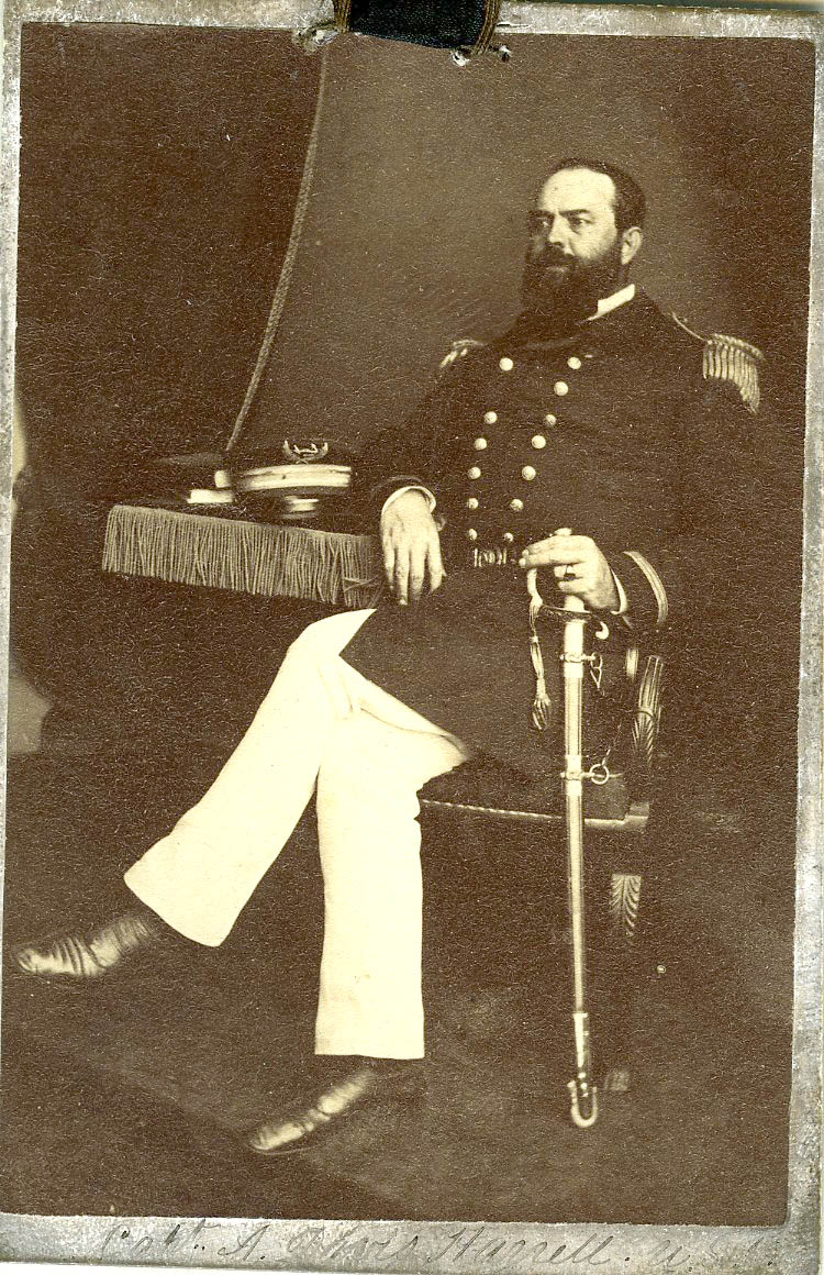 Original photographs of ancestors constitute one final and quite valuable type of document that occasionally turns up in private claims. The reasons photographs appear in these files, especially in the pension-related petitions, remain unclear, except perhaps to provide a human dimension to the claim. Two noteworthy examples in the Accompanying Papers involve the claims of Helen Harrell and Thomas N. McAfrey. In 1874 Helen O'Hara Harrell applied to Congress for a Navy pension following the death on December 16, 1871, of her husband, Capt. Abram Davis Harrell. Her lengthy and sometimes dramatic petition recounted Harrell's naval career, his resulting service-related illnesses, and forced retirement at the close of the Civil War, which left the couple destitute at the time of his death. Affixed to the petition with a black ribbon, probably for added dramatic affect, Helen enclosed a photograph of Captain Harrell, taken in Naples, Italy, in 1859 while he was serving as first lieutenant on the USS Macedonian, the flagship of the U.S. Navy's Mediterranean Squadron. Somewhat ironically, the photograph featured a rather stout and healthy-looking naval officer bedecked in his finest uniform and presentation sword.24