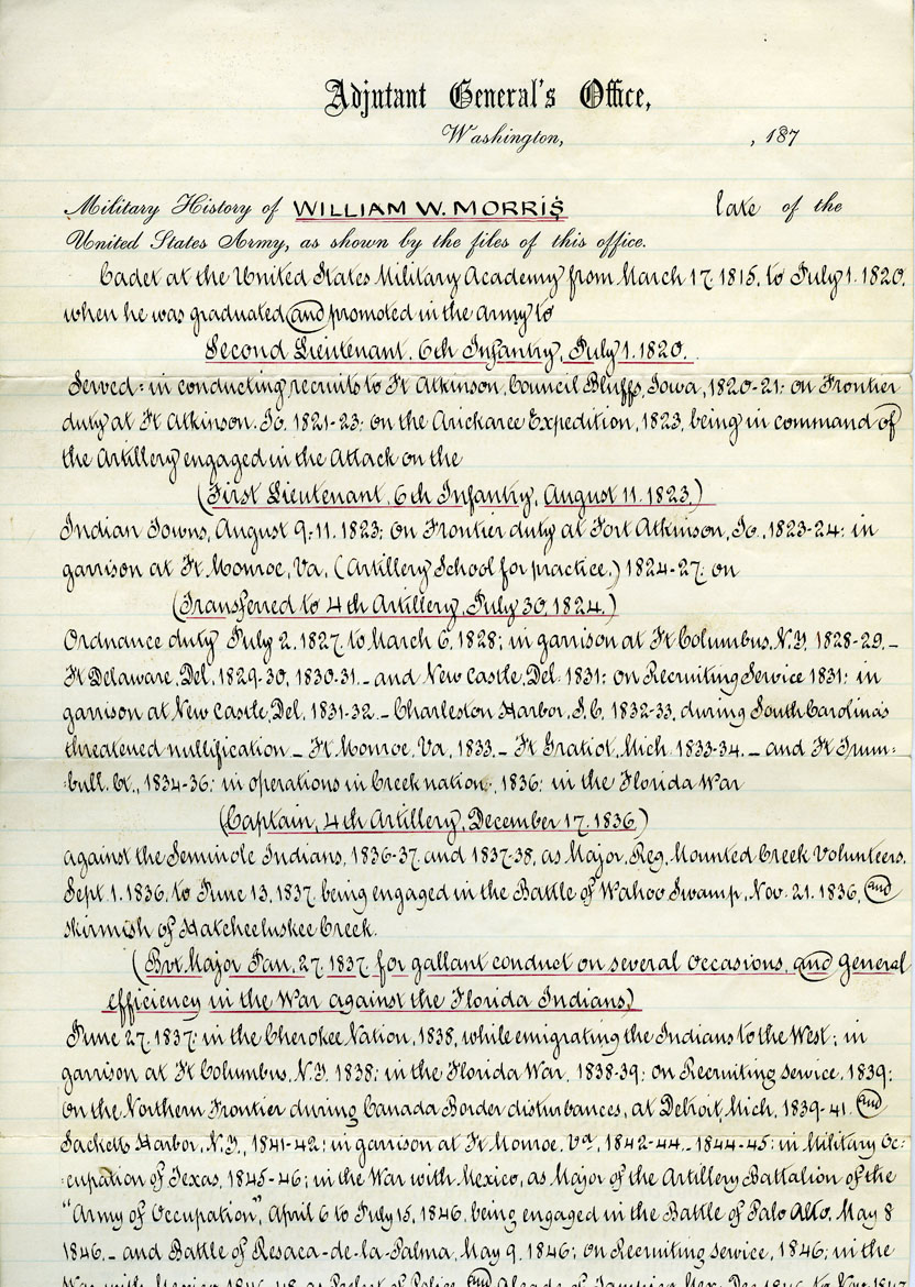 18. Military career of William W. Morris, compiled by the Adjutant General's Office, n.d.; Mary A. Morris File; Accompanying Papers [42A-D1]; Legislative Proceedings; 42nd Cong.; RG 233; NAB.