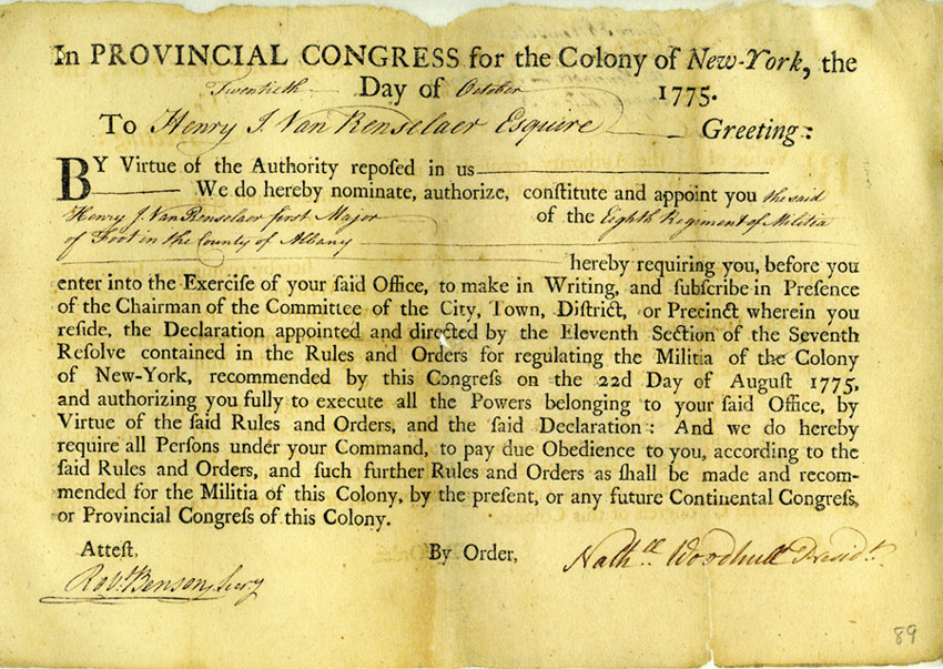 The survivor's pension claim of Margaretta Van Rensselaer, whose father Solomon Van Rensselaer served a distinguished career in the War of 1812, contained handwritten copies of several impressive military appointments, from lieutenant and captain of light dragoons in 1793 and 1795 (both issued by George Washington), to major of cavalry in 1800 (issued by John Adams), as well as an 1819 appointment as major general of New York State militia signed by Governor DeWitt Clinton. Surprisingly, the claim also included a rare colonial commission for another relative, Henry J. Van Rensselaer, who was appointed first major of the Eighth Regiment, Albany County (N.Y.) Militia of Foot on October 20, 1775.19