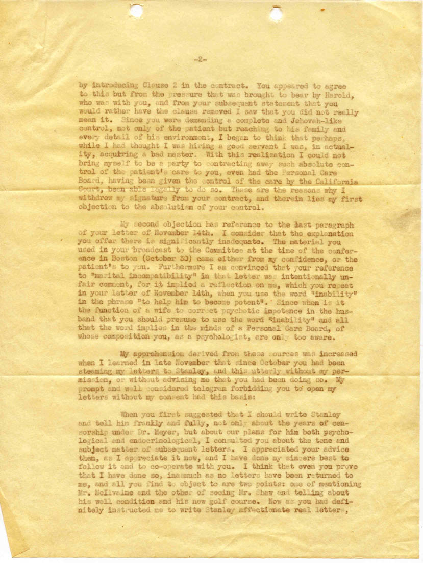 However, Stanley's siblings secretly had extended the contract. New agreement in hand, Dr. Kempf rejected endocrine treatment for Stanley and barred Katharine from visiting Riven Rock. He then tossed out the trump card—writing (and copying Dr. White and the Personal Care Board) about "the difficulties Stanley experienced in trying to establish his potency and your inability to help him become potent [emphasis added]." He concluded that she and Stanley were incompatible, and he recommended divorce.