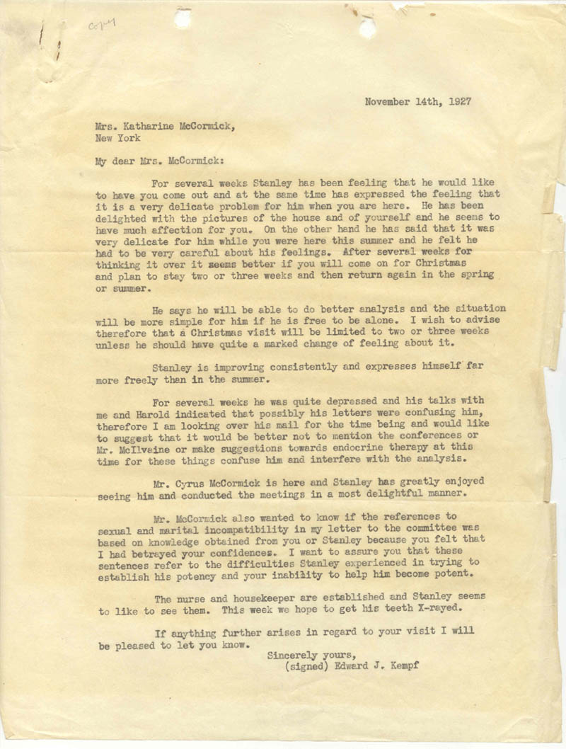 Dr. Kempf blamed Katharine for impeding his work with Stanley, later writing to White that "Stanley was improving marvelously until Mrs. McCormick came out" [to visit]. Dr. Kempf suggested that Katharine not visit Stanley because "he says he will be able to do better analysis and the situation will be more simple for him if he is free to be alone." He also wrote he was screening her letters to her husband.