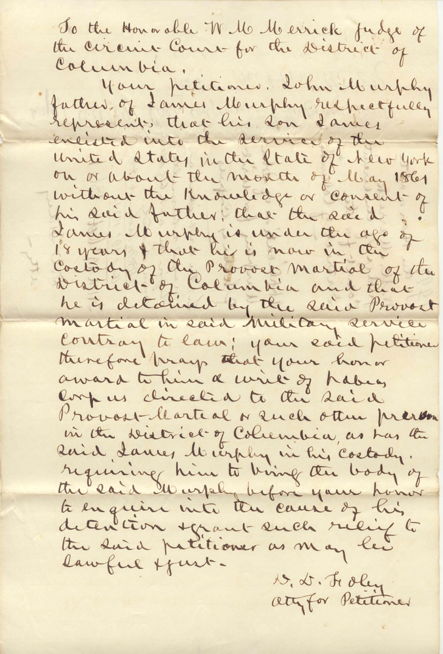 The habeas case that brought such a forceful response from the executive branch had to do with a 17-year-old boy, James Murphy, who had enlisted in the 12th New York Volunteer Infantry. James's father, John Murphy, demanded a writ be issued as his son was underage and had enlisted without his parents' consent. Moreover, contended the father, his "son is now anxious to return [home] & your Petitioner is desirous of having him discharged from" his military unit. Murphy quickly procured a lawyer, D. D. Foley of Washington, who petitioned Judge Merrick for the writ.