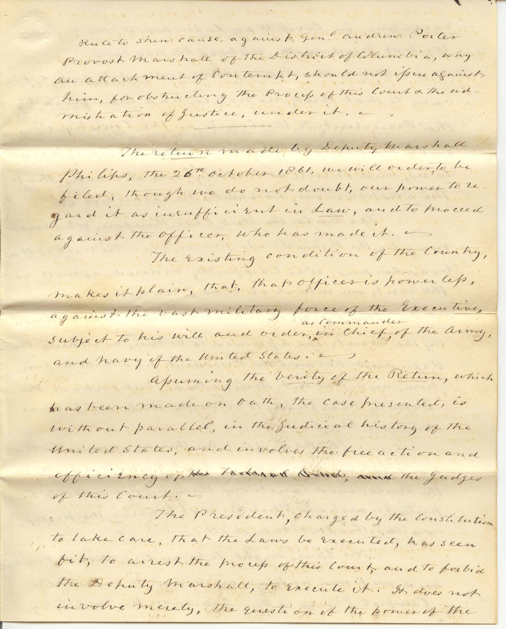 The court determined that it would not take any steps against the deputy marshal because, as Judge Dunlop explained, "The existing condition of the Country, makes it plain, that, that officer is powerless, against the vast military force of the Executive." Still, this case was "without parallel, in the Judicial history of the United States, and involves the free action and efficiency of the Judges of this Court." Rather than take care that the Constitution and laws of the United States be faithfully executed, the President "has seen fit, to arrest the process of this Court, and to forbid the Deputy Marshal, to execute it."