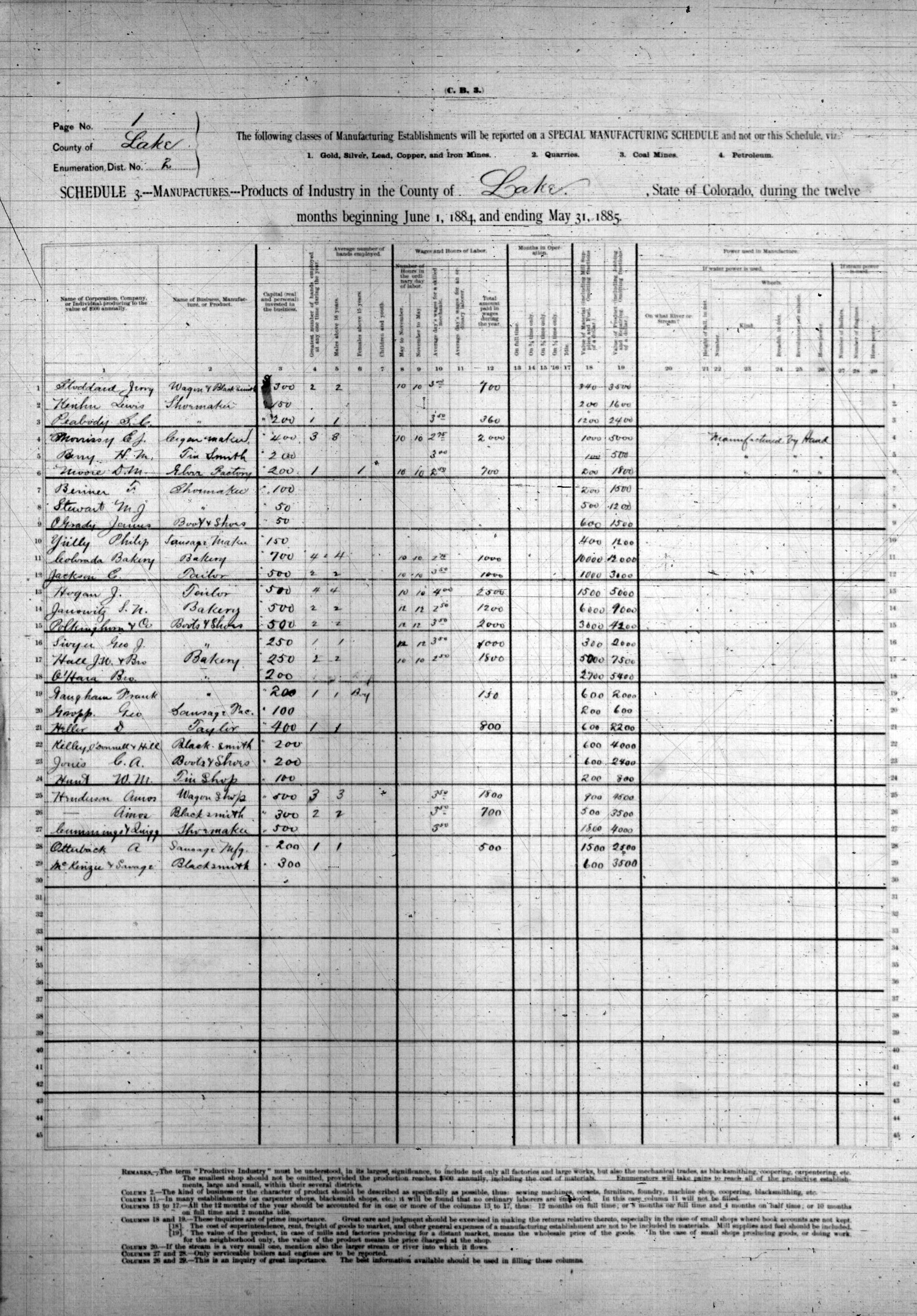 The 1885 manufactures schedule was specifically for corporations, companies, or individuals producing at least $500 annually. The schedules provide information on the number of people employed by the company, the wages provided and the hours required for skilled mechanics versus ordinary laborers. The form also asks for the total amount paid in wages during the prior year, the value of materials and products produced by the company, and the number of months the company was in full-time or part-time operation. The final section of this schedule gives information on the types of power being used by the company—water power versus steam power.
