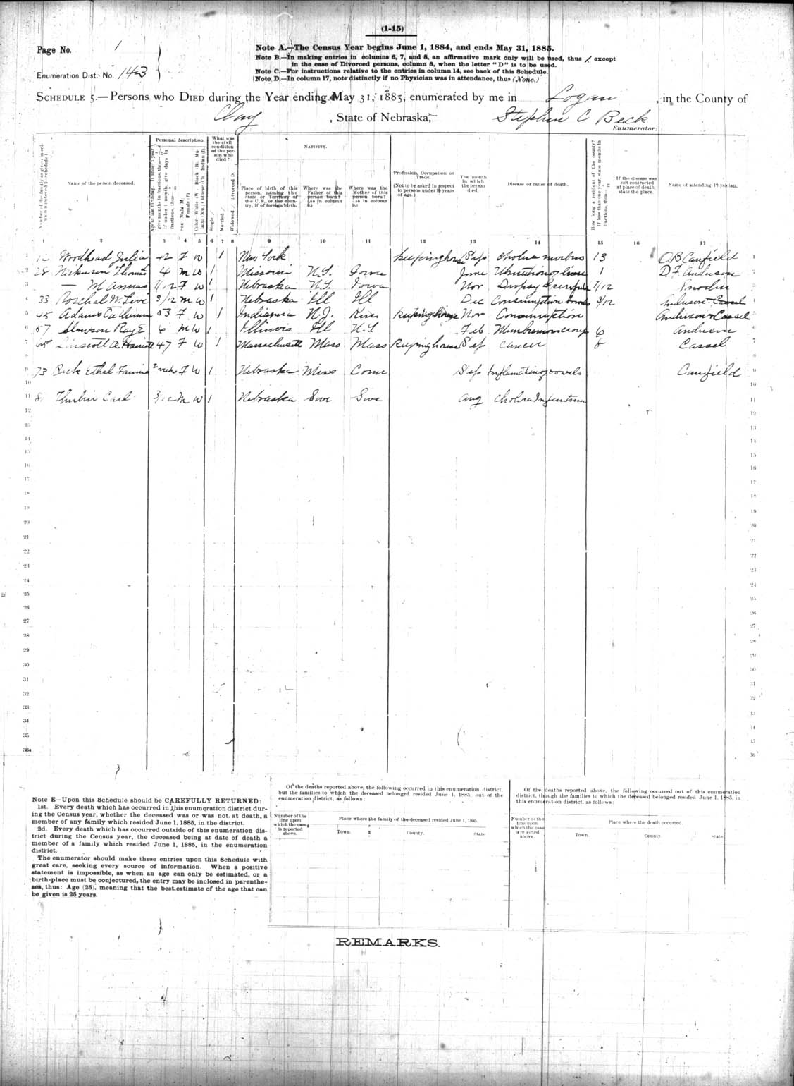 The 1885 mortality schedule enumerated all individuals who died between June 1, 1884, and May 31, 1885. This schedule was to include individuals who died within the district, even if they had no family in the district, and individuals who died outside the district but had family within the district.
