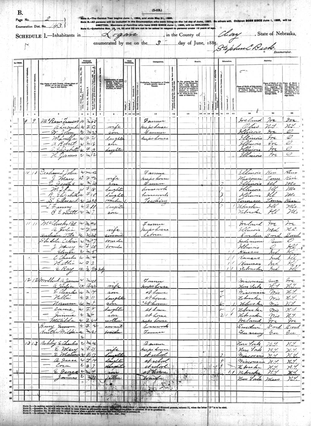 1. Population Schedule: Clay County, Nebraska, ED 143, p. 2; Schedules of the Nebraska State Census of 1885 (National Archives Microfilm Publication M352, roll 9) Records of the Bureau of the Census, Record Group (RG) 29; National Archives and Records Administration (NARA), Washington, DC.