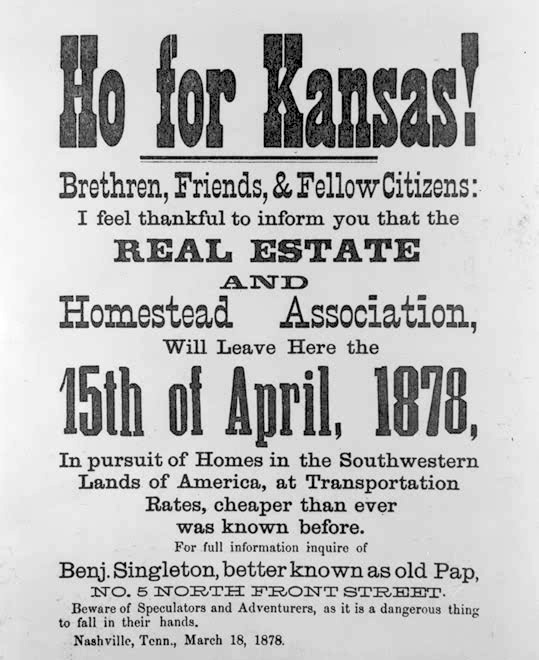 Benjamin Singleton was well known and respected in his Tennessee community as a skilled carpenter, cabinetmaker, and undertaker. During slavery, he ran away several times and finally escaped to Canada via the Underground Railroad and later moved to Detroit. After the Civil War, Singleton returned to Tennessee, where he resumed his craft as a carpenter and maker of cabinets and coffins. Working as an undertaker, he saw the results of violence on African Americans by former Confederates. He also resented white landowners who consistently cheated and exploited their black sharecroppers. In 1869 Singleton founded the Tennessee Real Estate & Homestead Association and began to organize blacks in his state to form colonies and settle in Kansas.3