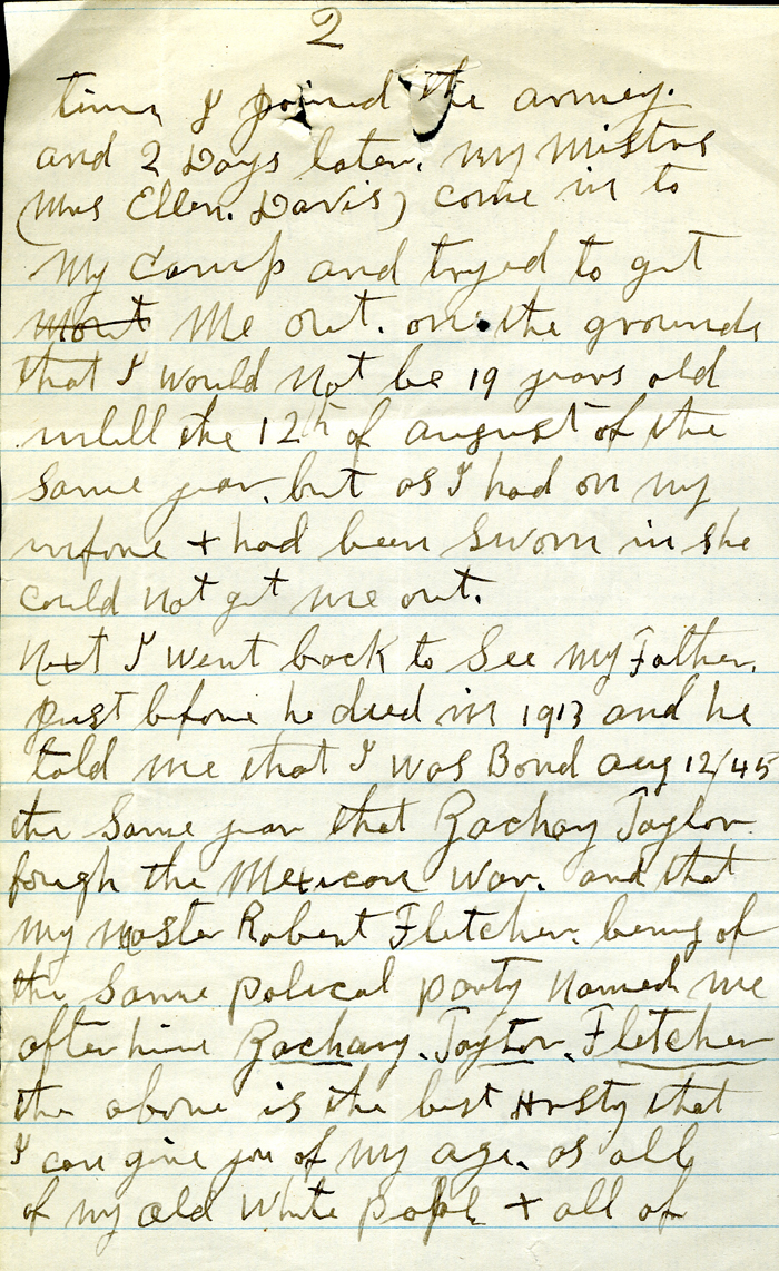 Next I went back to see my father, just before he died in 1913 and he told me that I was [born] Aug 12 / [18]45, the same year that Zachary Taylor fough[t] the Mexican war, and that my master Robert Fletcher being of the same political party named me after him—Zachary Taylor Fletcher. The above is the best mostly that I can give you of my age, as all my old white people and all of my brothers and sisters of 10 are dead. Mother died when I was 9 years old and my father died 3 years ago at the age of 93.