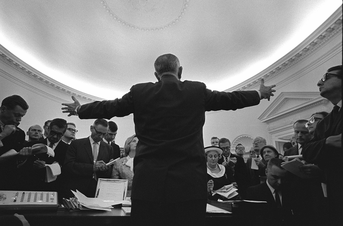 When Johnson was majority leader in the Senate, reporters started calling him powerful. His reaction was that the only power he had was the power to persuade—which prompted another senator to observe, "Good God Almighty, that's like saying the only wind we have is a hurricane." It was legendary, but it was real, and it was a power Johnson carried with him into the White House. John F. Kennedy had had an ambitious agenda, but he had faced a Congress that was often hostile and almost always reluctant to move. So many of the Kennedy initiatives were still stalled in committees.