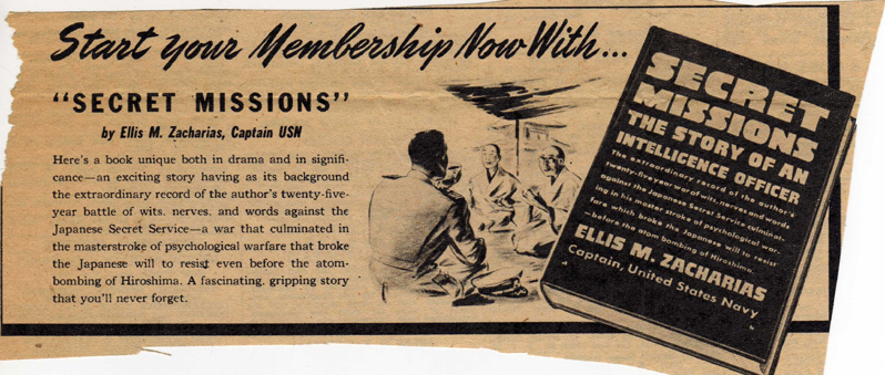 While on detail to OWI, Captain Zacharias submitted several lengthy reports and proposals, all designed to obtain a role for himself in the occupation of Japan. No action was taken. In addition, he made many public appearances as a representative of the Navy for the purposes of creating good will and to combat the current feeling that naval strength should be reduced and the armed services merged. He was commended by both the Navy (but probably not the Army) and public officials for his efforts. Otherwise frustrated and left with few remaining official duties, Zacharias used this postwar period to write his controversial autobiography, Secret Missions.
