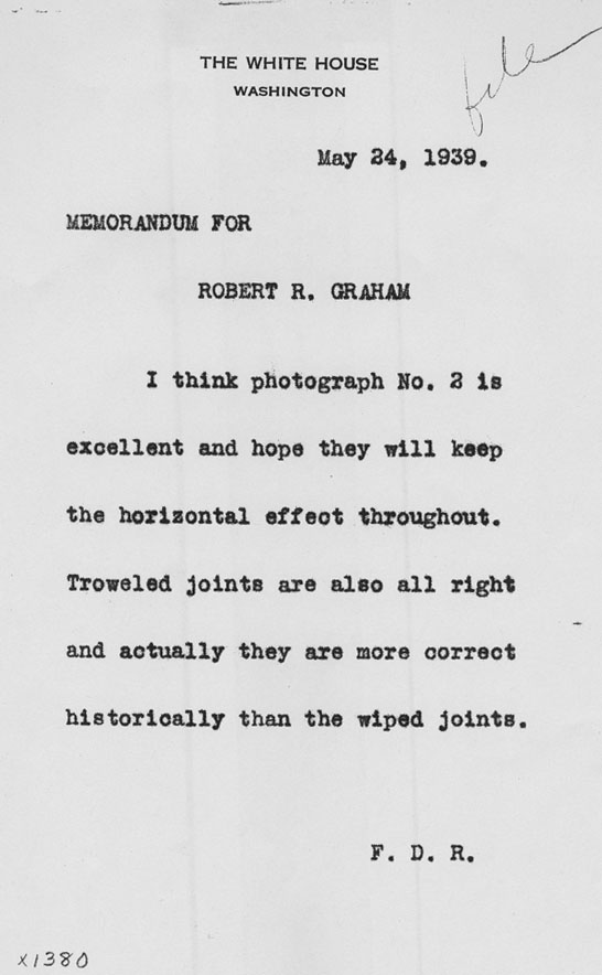 FDR's interest went far beyond early planning and curriculum. At various stages of construction, the President and the architect, Robert R. Graham, exchanged letters and met in person. Regarding stonework, FDR approved of troweled joints and added that "actually they are more correct historically than the wiped joints." The two men also agreed to paint the exterior woodwork "a shade slightly off white in a very light putty or ivory color."