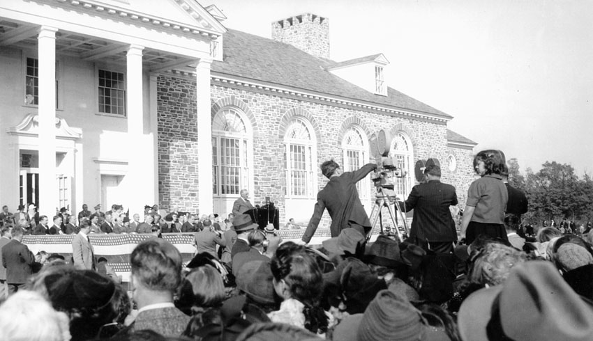 FDR readily accepted the invitation to dedicate the new schools. On October 5, 1940, at 2:45 p.m., the President spoke for almost 20 minutes in front of the new Franklin D. Roosevelt High School. The National and Columbia Broadcasting Companies broadcast the speech on the radio, and newsreel cameras recorded the event. FDR related the dedication of the schools to Hyde Park, commented on the construction, and emphasized the importance of education. Finally, he connected the schools to his New Deal policies and to the world.