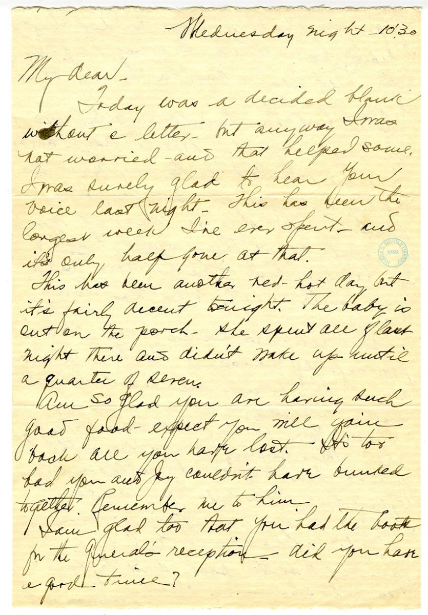 “It was so blazing hot last night I didn’t have the nerve to keep on enough clothes so I could have a light long enough to write a letter.”