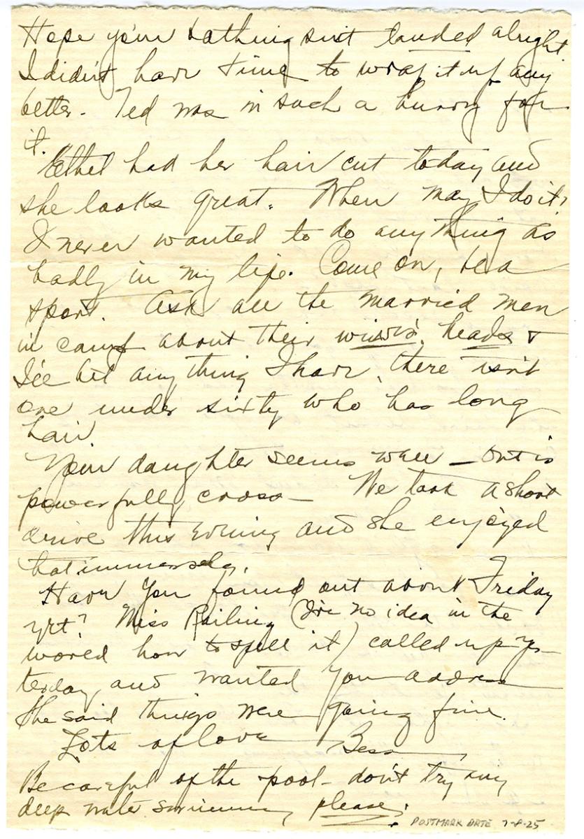 Judging from the tone of my grandmother’s letter of July 7, 1925 they had engaged in a face-to-face fracas over the hair in the days prior to his leaving.