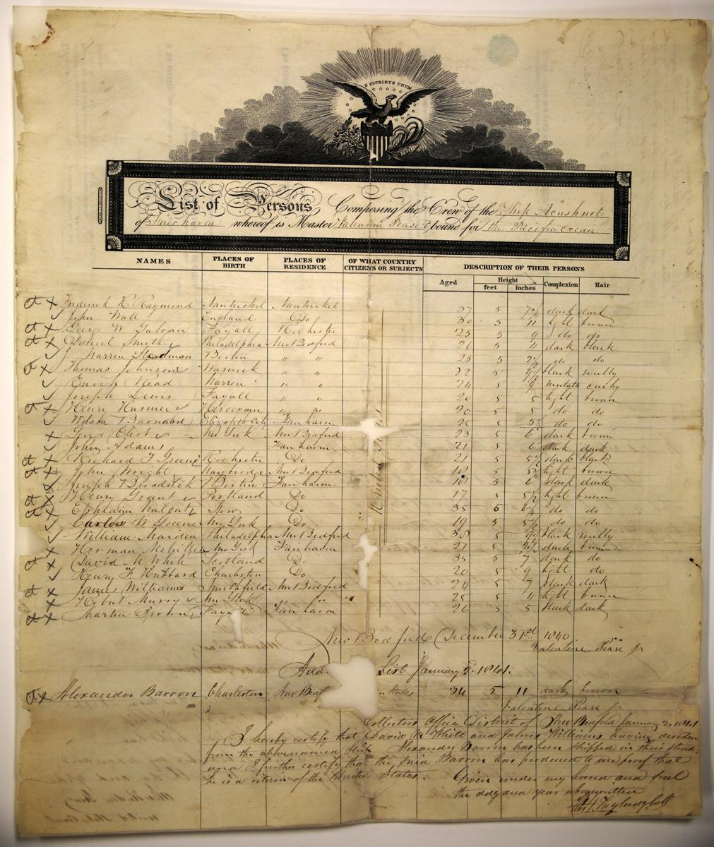 The crew list showing these 26 names was signed by Capt. Valentine Pease on December 31, 1841. Two days later, Pease had to amend the list to note the first two deserters from the crew and the late signing of a replacement. The collector of customs for New Bedford, Massachusetts, retained a copy of the crew list as required by an 1803 act of Congress governing merchant ships bound for foreign ports.