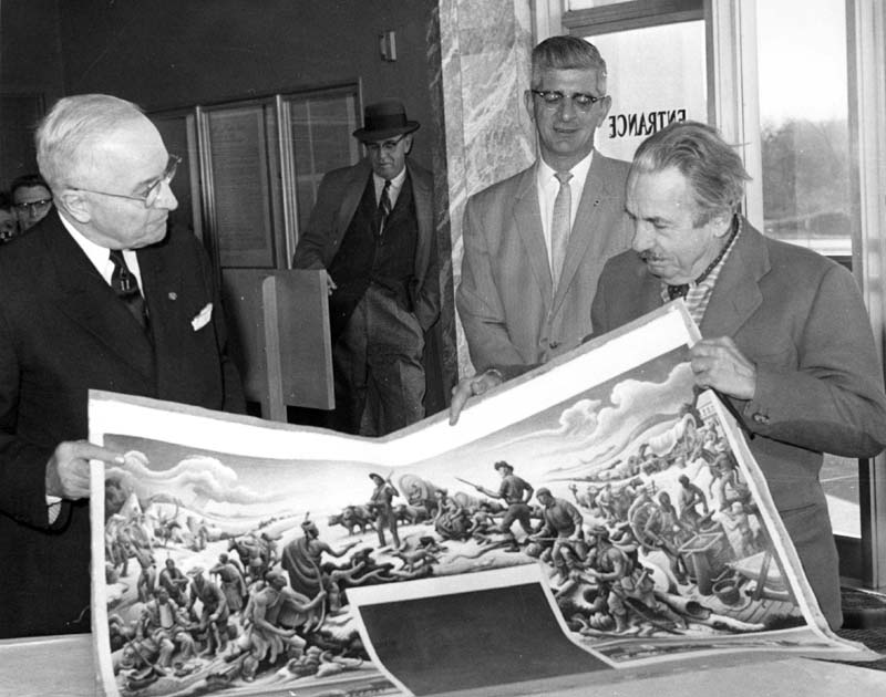 Lloyd was probably unaware of this slight but problematic relationship between Truman and Benton when he made his first visit to Benton’s Kansas City studio in April 1957. Wayne Grover, the Archivist of the United States, went with him. Grover headed the National Archives and Records Service, which would run the Truman Library once it was donated to the government by the Truman Library corporation. He took a strong personal interest in the new library and, like Lloyd, thought a mural would enhance the lobby. Benton showed Lloyd and Grover his current mural project, which was about the early history of Canada. After their short tour, Lloyd and Grover asked if Benton would be interested in painting a mural for the Truman Library. He said he would.