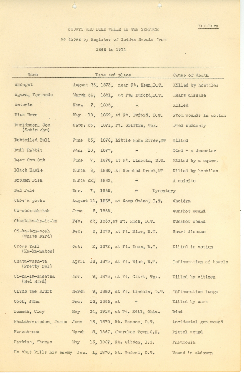 In Records of the Department of Veterans Affairs, RG 15, entry 61, you will find Records Supporting Claims for Service During the Indian Wars, 1892–1931. This series relates to both Indian service and non–Native American service, and several files relate to Indian Scouts. Some are copies of muster rolls for different detachments of Indian Scouts, and one useful file provides a list of "Scouts Who Died While in the Service." The information is taken from the Registers of Enlistments of Indian Scouts who served from 1866 to 1914. Several alphabetical lists record the scout’s name, date, place, and cause of death.