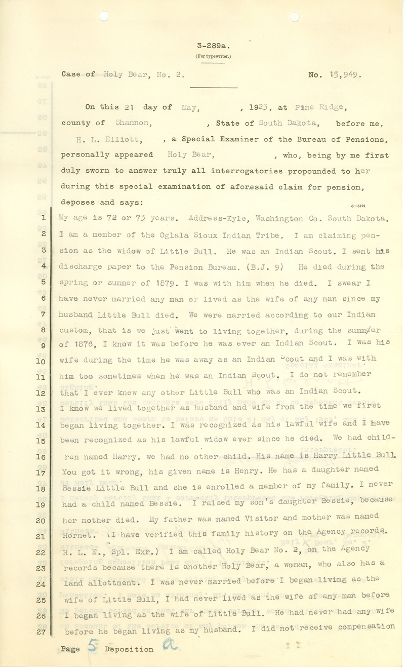 In the deposition dated May 21, 1923, Holy Bear, a member of the Oglala Sioux tribe, states that, "My age is 72 or 73 years." She claims that she is the widow of Little Bull, and that they "were married according to our Indian custom" prior to his service as an Indian Scout. She was also with him when he died during the spring or summer of 1879. Holy Bear also provides information about her family. Her father’s name was Visitor, and her mother was Hornet. She had a son with Little Bull named Harry (Henry) Little Bull and was raising his daughter Bessie since the death of her mother. She also points out that she is called Holy Bear No. 2 on the agency records because there is another woman with that name who also has a land allotment. In addition to Holy Bear’s testimony, other depositions in the file also provide great genealogical information.