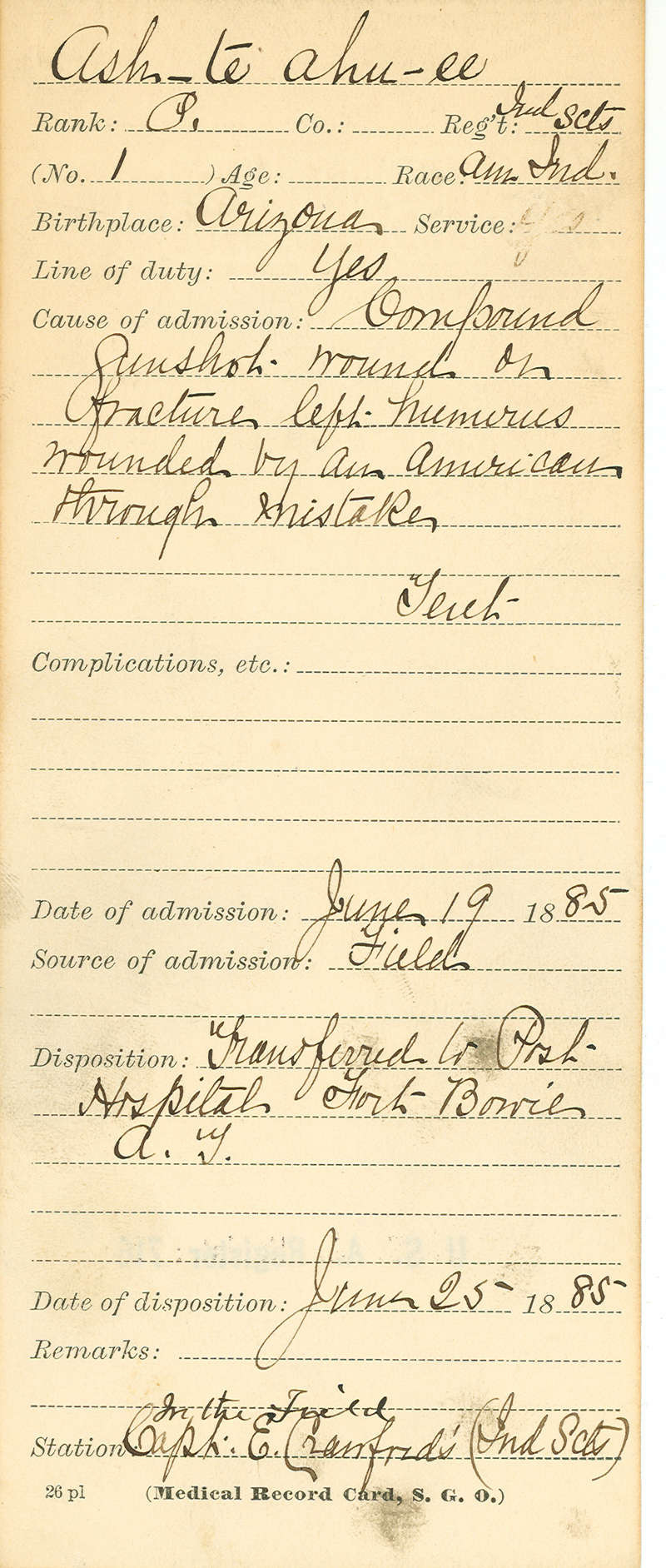 Some medical records relating to Indian Scouts may be found in RG 94. In entry 529 you will find carded medical records covering the years 1821 to 1885, and in entry 530 are carded medical records for 1894 to 1912. These cards include information relating to Indian Scouts admitted to hospitals for treatment and may include information such as name, rank, organization, age, race, birthplace, date entered service, cause of admission, date of admission, hospital to which admitted, and disposition of the case. If you are researching several Indian Scouts at a particular post, you might wish to consult the hospital registers found in RG 94, entry 544. Regular Army Indian Scouts appear as patients in post hospital registers. The registers generally show the name of the patient, the date of admission, the nature of the ailment, and the date and nature of the disposition of the case.