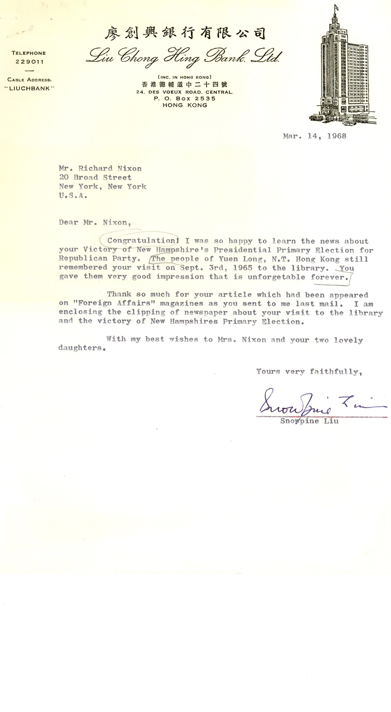 After losing the 1960 presidential campaign to John Kennedy and the 1962 California gubernatorial election to Pat Brown, Nixon moved to New York City to become the lead partner in a major law firm. Part of Nixon’s work with the firm involved traveling around the world to meet with clients, a convenient reason for the former Vice President to keep himself in the public eye by making pronouncements on foreign policy at home and abroad. He made several such passes through Hong Kong, meeting with Liu on three occasions and visiting the library himself in 1966.
