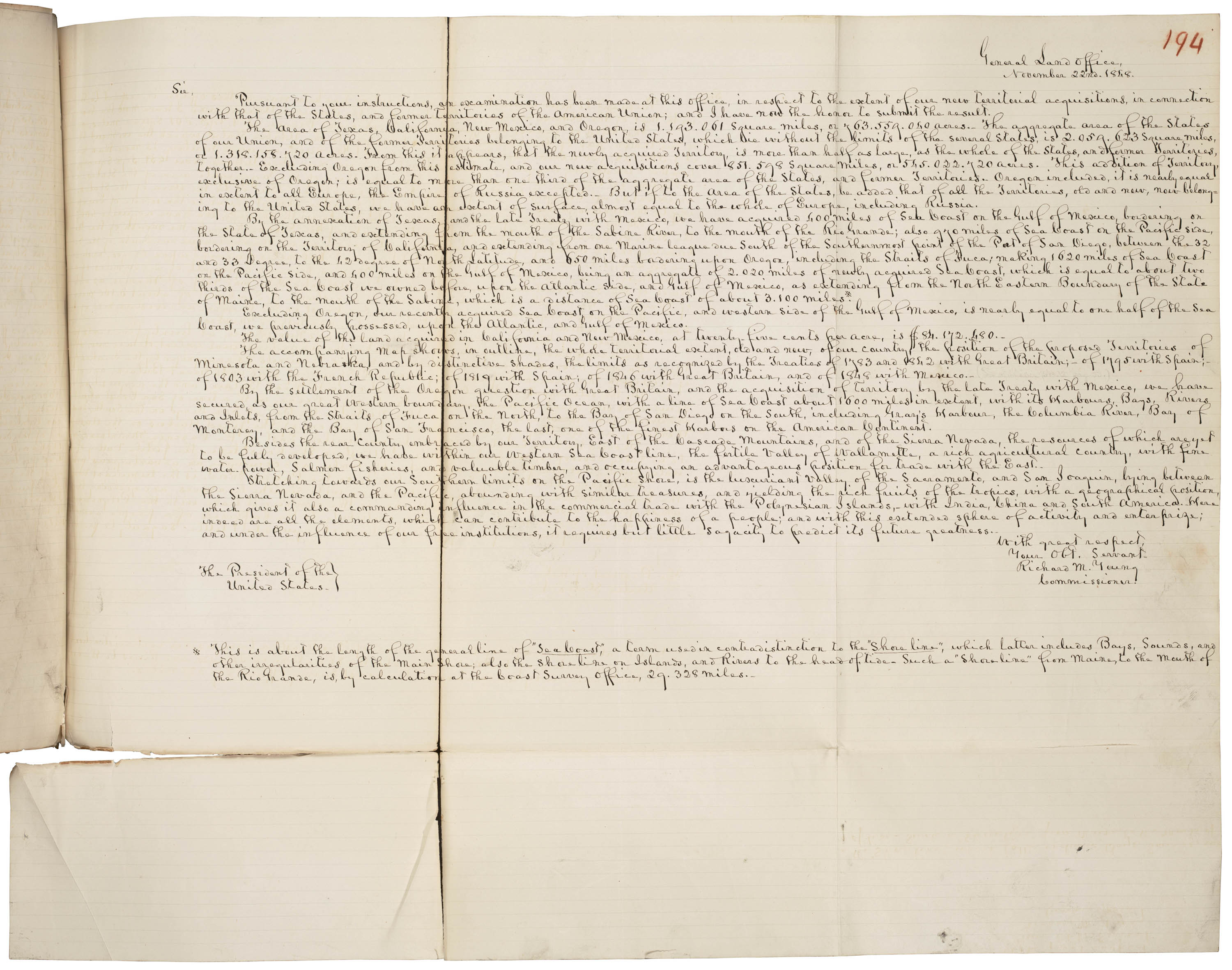 The map also reflects President Polk's view that the best solution to the sectional crisis over slavery in the territories was the extension of the Missouri Compromise line to the Pacific Coast. The marking of the proposed California state boundary on the Archives copy of the map used during the course of the debate over the Compromise of 1850 makes it a unique document.