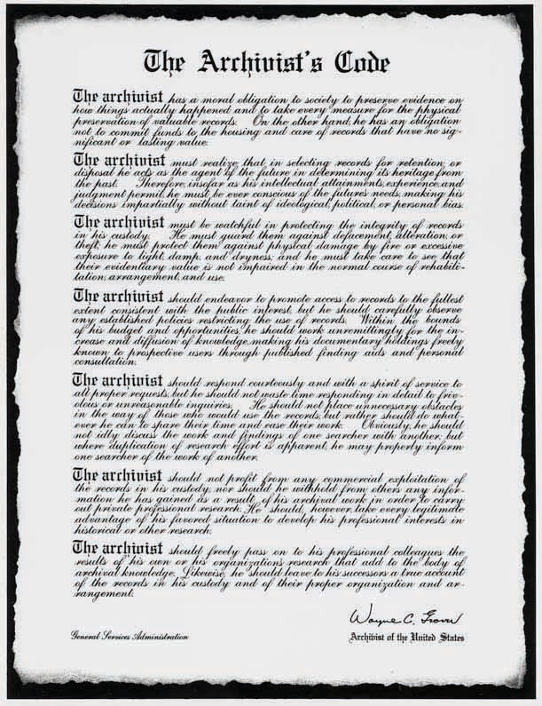 He believed in the importance of training archivists and gave much attention to it. He believed in basics and professionalism. "It is not sufficient," he stated in a 1953 address, "that he consider himself a technician maneuvering empty vessels on a shelf, no matter how dexterous his technique, how valuable and sound his principles of arrangement. The vessels are full. An archivist who doesn't have some inkling of the significance of their contents is, in my book, not worth his salt. In the National Archives, the best foundation on which to stand in order to acquire such an inkling is still the study of American history and government." It was because of his concern about the important mission and responsibilities of archivists that Grover, with the assistance of the National Archives staff, wrote the "The Archivist's Code," copies of which can be found today in many archival institutions and on the walls of many offices in the National Archives.