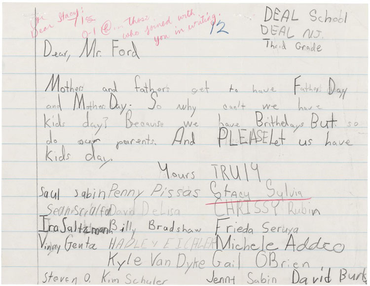 A letter to President Gerald R. Ford seeking a holiday in honor of "kids," from Gail O'Brien and her fellow third graders in New Jersey, got a official response.