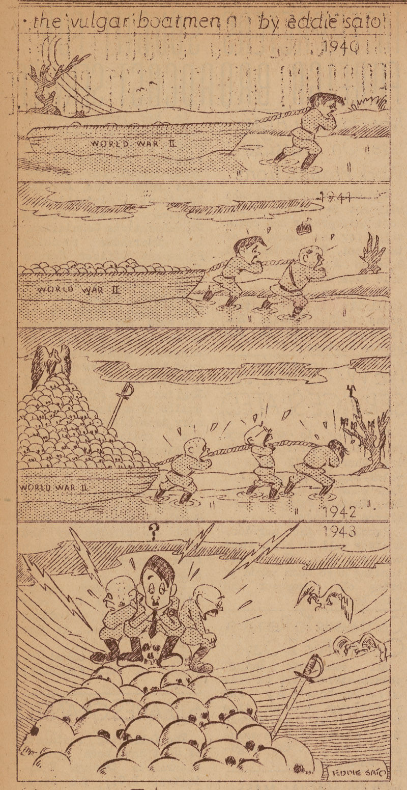 Despite the difficult living conditions, people continued to express themselves artistically. Comic strips and other works of art appear in most WRA relocation center newspapers. One example is the artwork of Eddie Sato, a staff artist for The Minidoka Irrigator. Sato, a talented political cartoonist, created a comic strip character that he considered calling Potato, but the newspaper decided to run a character-naming contest. Three articles about the contest provide information about Sato, the cartoon character, and the Minidoka community. The November 7, 1942, issue announced Yasuko Koyama's winning submission, Dokie. 9 Dokie first appears to be an ordinary comic strip character, but a closer look at the strips reveals that Sato captured the reality of internment. In May 1943, Sato left the Minidoka relocation center to serve in the military. Although he was no longer interned, the newspaper occasionally ran articles about him, including information about his winning art contest submissions and his return visit to Minidoka. 10 Eddie Sato is just one example of the numerous Japanese American internees who went to war for a country that had confined its loyal citizens behind barbed wire fences.