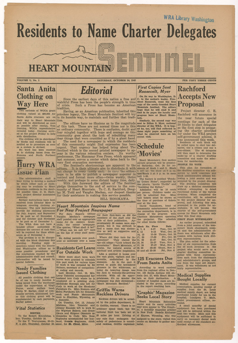 8 "The Social World: Your Home and Mine," Heart Mountain Sentinel, Oct.24, 1942, vol. I, no. 1, p. 3, Field Basic Documentation of the War Relocation Authority, 1942–1946 (C53, roll 58), RG 210.