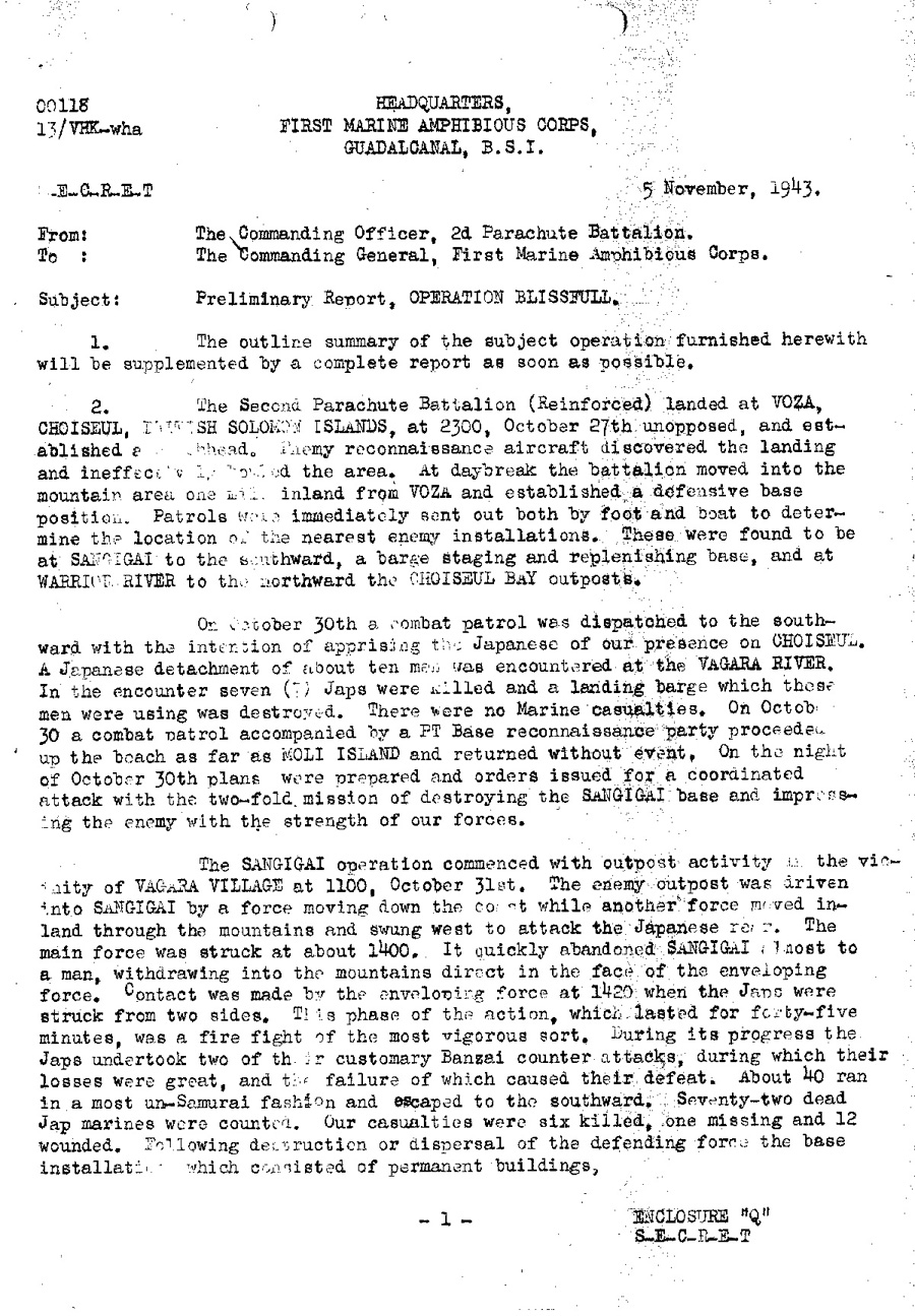 The Allies had landed on Vella Lavella Island, one of the western Solomon Islands, on August 15, 1943. The first elements of the Second Marine Parachute Battalion, First Marine Parachute Regiment, First Marine Amphibious Corps (IMAC) began landing on Vella Lavella on October 1. The rest of the regiment arrived later in October.