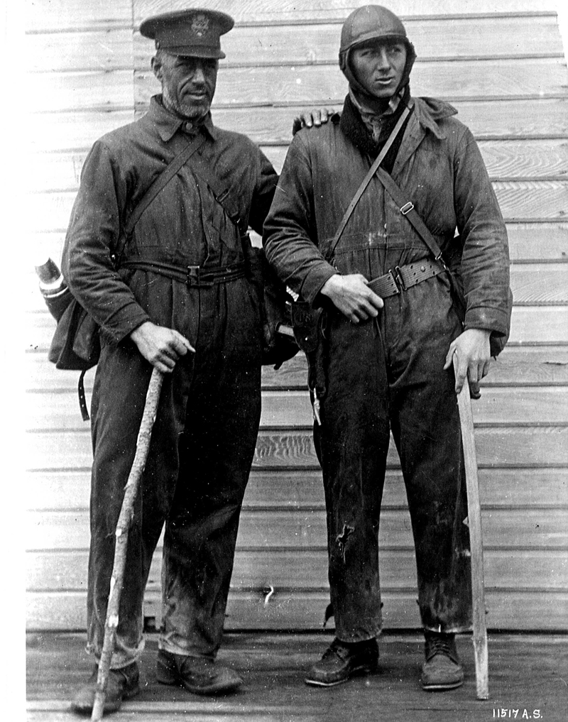 The first and second night they burned parts of their plane to stay warm, smoked tobacco, and alternated sleeping. The thick fog that had caused their crash now inhibited their rescue. By the third day, with no sign of the weather lifting and mindful of the risk of stumbling off a precipice in the fog, they started walking. Taking doses of their emergency liquid rations for energy—two tablespoons constituted a meal—they made their way down the mountain following a creek bed until, on May 6, they finally reached the ocean shore. Along the bay, they found an unoccupied cabin filled with hotcakes and other food. They recovered their strength and rested their eyes—both were heavily affected by snow blindness—and reconnoitered their position. On the tenth, they set out again. Later that afternoon, they were rescued.