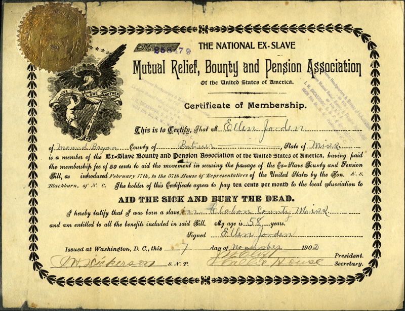 There were a number of ex-slave pension organizations within the movement—the National Ex-Slave Pension Club Association of the United States (Vaughan's Justice Party); the Ex-Slave Petitioners' Assembly; the Great National Ex-Slave Union: Congressional, Legislative and Pension Association of the U.S.A.; the Ex-Slave Pension Association; the Ex Slave Department Industrial Association of America; and others—but there is a paucity of documentation for groups other than the National Ex-Slave Mutual Relief, Bounty and Pension Association of the United States of America (MRB&PA). The ex-slave pension organizations did not work together collectively, but there is evidence that officers of at least a few of these organizations were interested in joining forces and consolidating their groups.