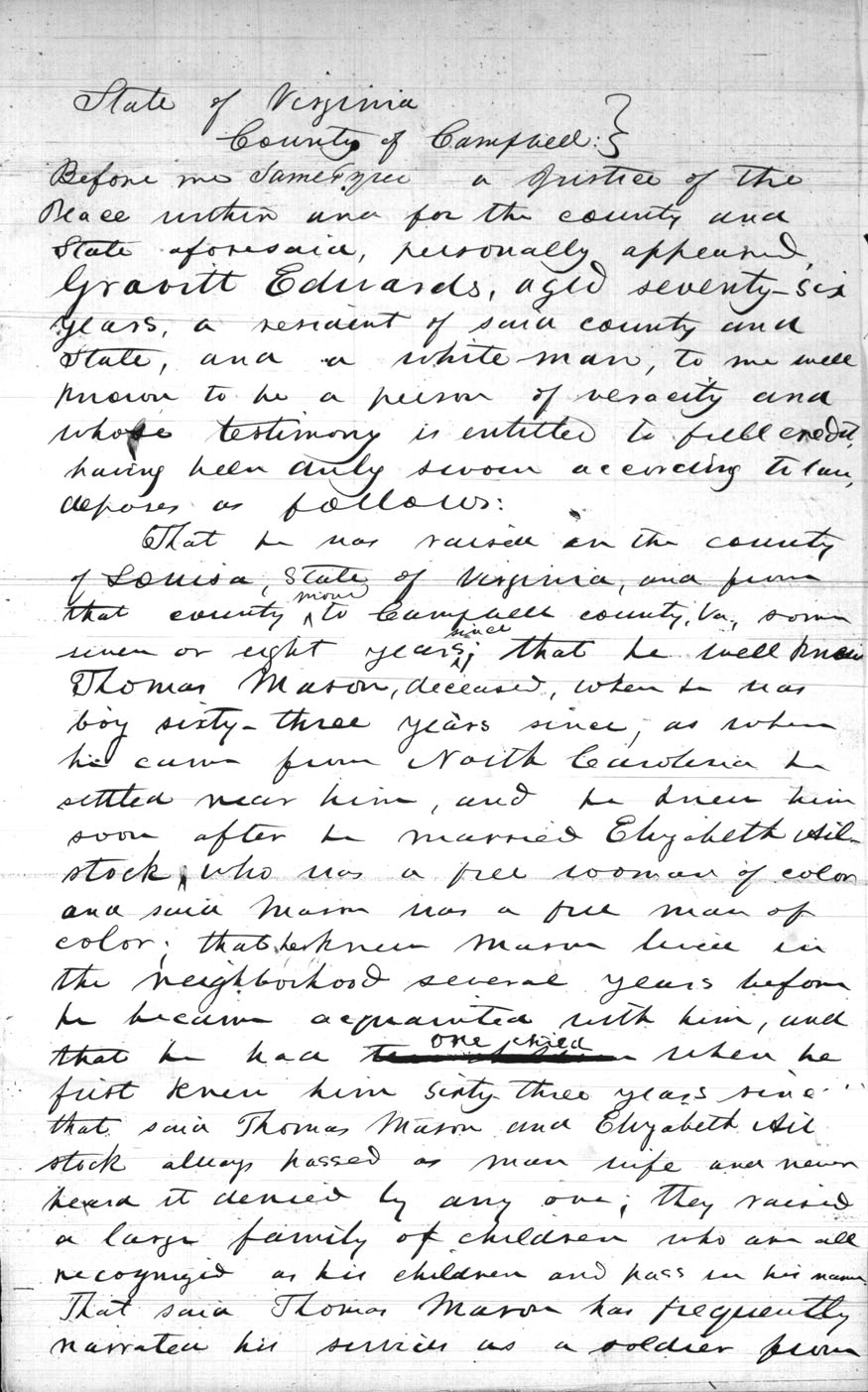 Gravitt Edwards had known the couple the longest, having met Mason 63 years before "as a young man," when the former soldier first moved from North Carolina to Louisa County and married Elizabeth Ailstock. Edwards confirmed that he had frequently seen Mason's discharge papers "and that none of his neighbors [had] ever doubted or questioned his services as a soldier; that great respect was paid him on account of his having served his country, and more privileges were then allowed him with his neighbors than other free persons of color."