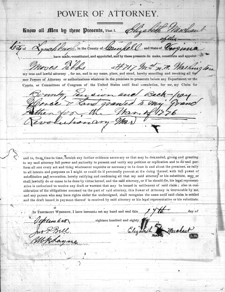 Elizabeth Mason passed away before ever receiving her widow's pension. About 30 years later in 1884, a granddaughter of the Masons, Elizabeth Merchant, of Lynchburg, Virginia, attempted to claim her grandfather's "Back-pay Horse & Land" owed to him as a Revolutionary War veteran. The Pension Office rejected Merchant's claim, explaining to her lawyer, a Moses Tibbs of Washington, D.C., that since neither the veteran nor the widow had been approved in the original petition, there was no obligation any descendants or heirs.