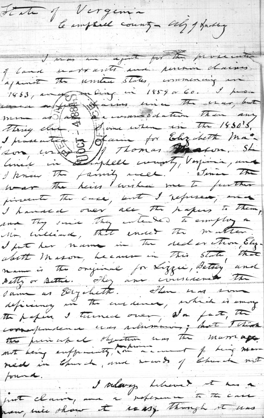 O.P.G. Clarke, the commissioner of pensions at that time, also contacted Elizabeth Mason's former lawyer, Charles W. Statham, to get more information about the old case. The now elderly Statham, explained that he believed that Elizabeth's denial was an injustice and perhaps a consequence of the charged political climate ascendant back in 1854 when the original claim was made.